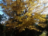 | コメント | 快晴。この日は一日中快晴で空気も澄んで、会のハイキングとしては、 この秋一番の良い天気になりました。 又、予想していた風も無く、やや冷え込みましたが、 絶好のハイキング日和になりました。 今回は、山と路としては初めての参加者は無く、全員参加経験者でした。 当日キャンセルが1名ありました。 バスの発車時間になっても来ないのでおかしい思っていました。 これが、連絡が無いと思っていたのが、実際はメールが入ってたのを、 私が、ミスでそれに気づかずにいました。 (帰りの電車の中で気付きました。) この方は、「もしかしたら行けなくなるかも知れない」 と言っていたので、 この時点で、もう来ないと判断して出発しました。 予想通り、バス停でも、バスの中もハイカーで混雑してました。 日影でバスを降りた後、やはりこの1名の方を見つけられ無い事を確認して、 歩き始めました。 今回のコースは登りは、6年前に会のハイキングで実施したのとほぼ同じ。 (この時は、途中から雨に降られて、城山の頂上では他に誰も居ない、 今回とは全くの別世界でした。) 日影キャンプ場で小休止。体制を整えました。 登りの前半は、砂利の車道の緩い登り1時間。 これは景色は単調ですが、参加者同士が並んで行けるので、 会話がしやすいのが、最大のメリットだ。 何時もの様にゆっくり雑談しながら進んで行きました。 深い谷あいの道で、日が当たらず、文字通りの日影林道です。 脇を日影沢の流れ。水量も少なく、冬らしい水の色をしている。 周りを見上げると、緑の針葉樹林の中に、 ところどころで黄色く紅葉が色どりを添えてました。 空気は涼し目。 高尾山頂への近道分岐のところで小休止。 まもなく、八王子市森林管理小屋に着。 ここで、林道から別れ、細い山道に入りました。 この道は地図に無いけど歩き易い道だ。 しばらく登ると、高尾山-小仏城山の尾根の尾根が見えてきて、 人声が聞こえ、紅葉も目だって来ました。。 急に行きかう人が増え、直ぐに一丁平らに到着しました。 名前の通り広く平らで、とことどころにテーブルが有り、多くの人が休んでました。 私達は、まず展望台へ直行。 期待していた、、富士山が真正面に、遮るものもなく、白く、くっきりと見えました。 もう、正午になってましたが、この日は、雲に隠れることなく見え、 冬でも、難しい時間帯なのに、。相当良い条件が揃った感でした。 ラッキーでした。 (右上の写真) 記念写真など撮ったあと、昼食の場所について色々意見が出ました。 展望台近くの休憩所は人で一杯で、結局少し戻った平らな所で、 たまたまテーブルが空いた所ににしました。 8人が一つのテーブルえは狭く、二つのテーブルに分かれました。 私は何時もの様にうどんを作りました。 今回も忘れ物なし。今回初めてうどん作りのリストを作りました。 今後はこれで大丈夫かもしれません。 我が家の今年最後の柿も、少し振舞いました。 皆さんからも色々振舞われました。 お隣さんから、焼肉の様な良いにおいが、漂って来ました。 これは刺激的でした。話題になり、今後の作りに影響か? 食事後、ここから登る事半時間位の道は 歩きやすく良く整備されてました。 小仏城山山頂の少し手前で、植物に詳しい参加者さんから、 黄色く紅葉した大木の名前を教えて貰いましたが、 「--カエデ」で、--の部分は忘れてしまいました。余り聞いた事の無い名前でした。 (右の写真) この方が、葉を見て名前を言ったのが印象的でした。 頂上は、東側が大きく開け、東京方面から関東平野が一望でした。 超高層ビル群の上に、スカイツリーもかすかに見えました。 ここで参加者の1名が都合で、別コース(東尾根)を下りたいとの事で、分かれました。 ここで記念撮影後、反対側の西へ行くと、 かなり逆光で光った富士山が大きくても、やや霞んで見ました。 下山開始。 コースは東海自然歩道で、前半は道が良く歩きやすい。 針葉樹林が多め。林間の枝の間から、 景信山から明王峠の稜線が見えたので、私は説明しました。 ここで土の上の落ち葉のせいか、参加者の転倒騒ぎが有りましたが、 地面が柔らかく怪我は無かった様です。 後半は、落葉樹が増え、ところどころで黄色勝ちな紅葉が逆光に輝き見事だ。 傾きかけた太陽に向かって進む感じで、見るに光線の具合が良い。 「これはいいね」と言うと、近くの参加者も同じ言葉が返りました。 ここでは紅葉がもう過ぎたはずの最盛期が、今の感じでした。 だんだん傾斜が増し、かなりな急な下りが続きました。 バス停ちかくの千木良茶屋に到着。休憩。 ここで私は酒饅頭を買ったりしました。 予定より大分早く着いたので、ここの店の人から、 「弁天橋経由で相模湖駅、又は甲州街道を相模湖駅まで歩く、 又は、高尾駅までバスで行く」 の提案が出されました。 私は、経験から,歩くのはどちらもシンドイと思い、 皆さんも決めかねている状況でした。 結局、私のわが