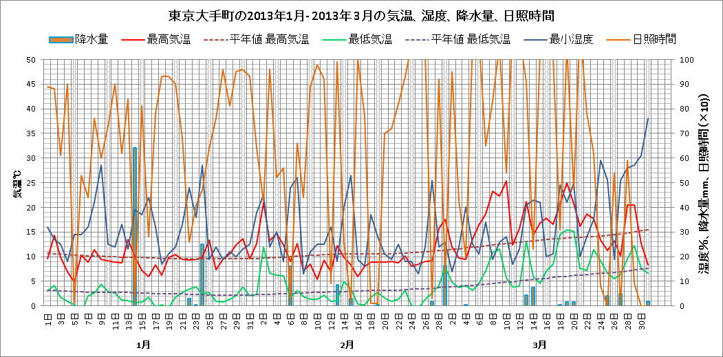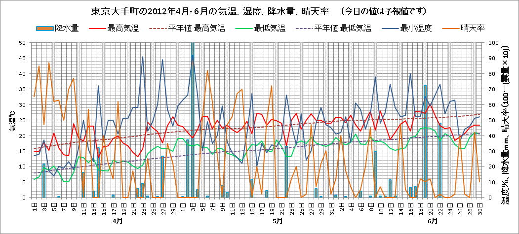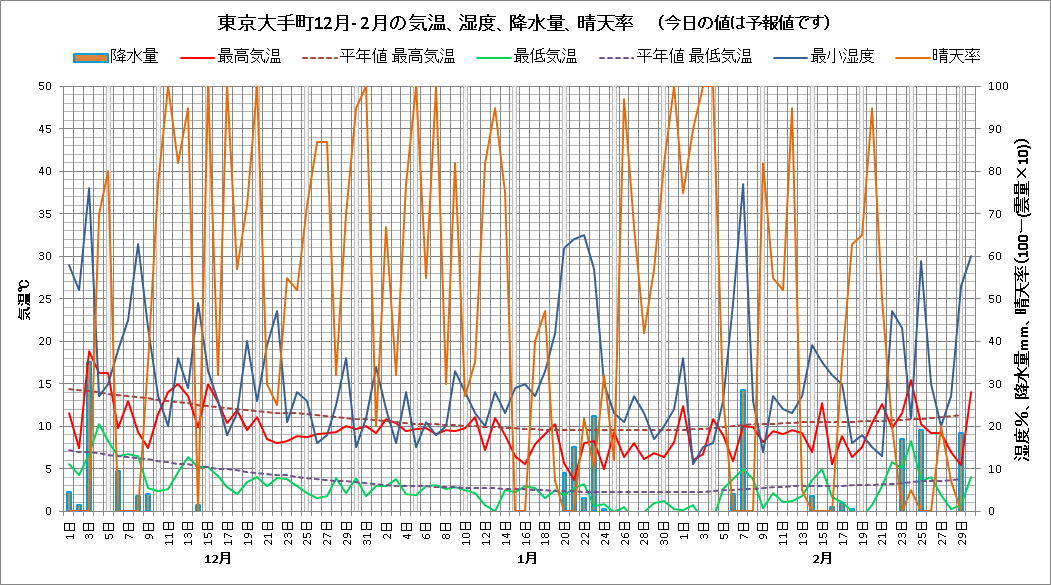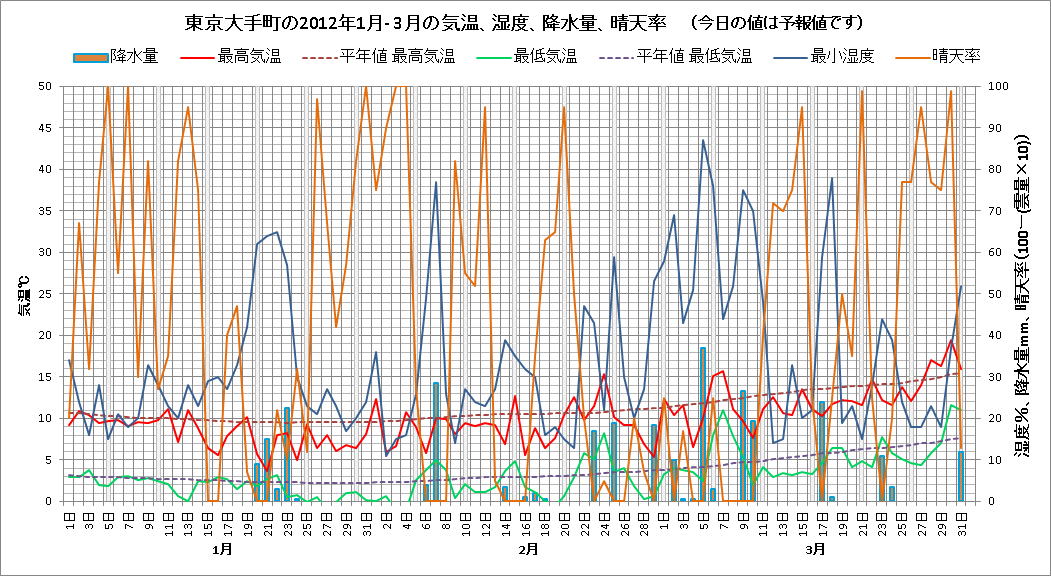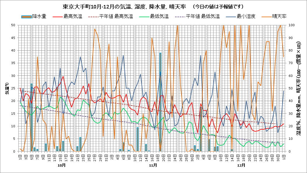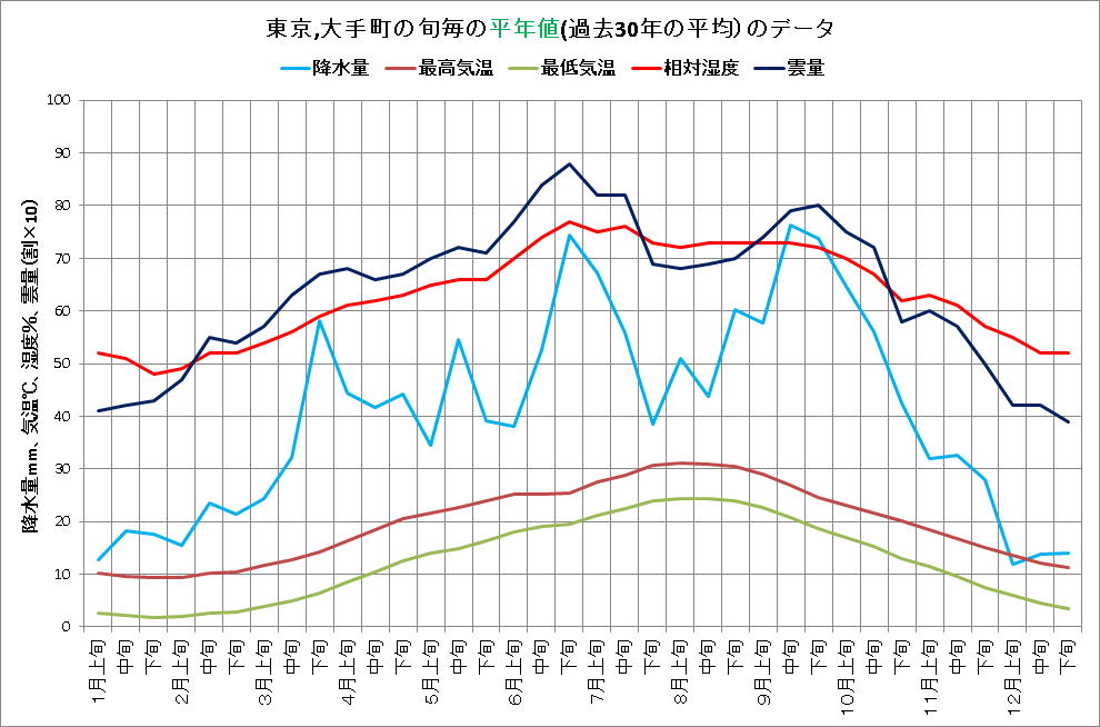 00、東京大手町の旬毎の平年値の降水量、最高,最低気温、湿度、雲量 ここをクリックで、このページのトップに戻る