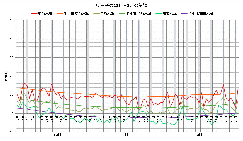 | 16日 | 6 | 10 | 7 | 9 | 2 | 6 | 6 | 10 | 12.3 | 21 | -14.5 | 帯状高気圧のやや谷間 | ||
