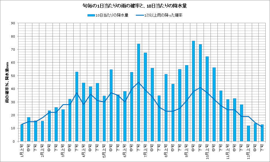 06、東京の旬毎の、1日当たりの1ミリ以上の雨の降る確率と、10日当たりの降水量、(過去30年平均) |