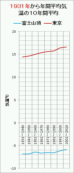 、富士山頂と東京の,1931年〜と、東京の1881〜の年間平均気温,月の日最高気温他の10年間平均値 ここをクリックで、このページのトップに戻る