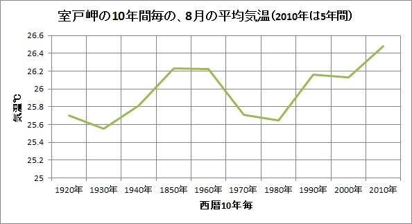 1881年〜1890年は13.6℃、2001年〜2010年は16.6℃、で120年間に約3℃上昇してます。