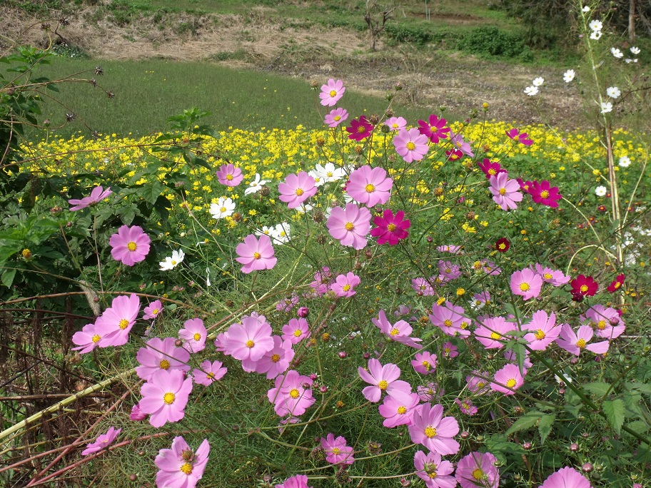 石老山入り口から顕鏡寺への途中のコスモス。後ろの黄色い花は名前は解りません。