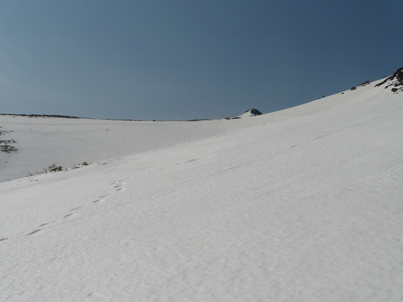 2014年4月 2日、くろがね小屋から、安達太良山頂への途中で頂上を望む