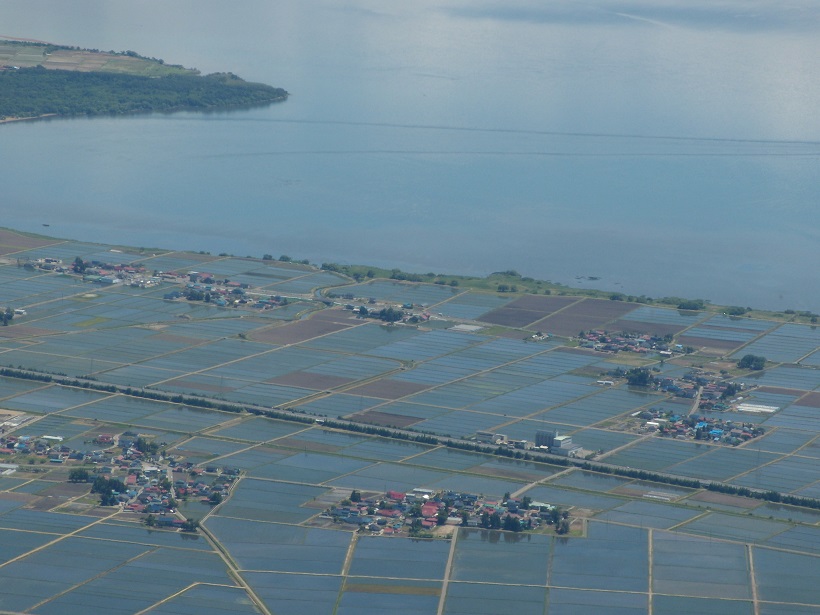 2015年6月7日 磐梯山頂上より見た猪苗代湖と田んぼ。 磐越道が太い直線。国道49号が湖より。