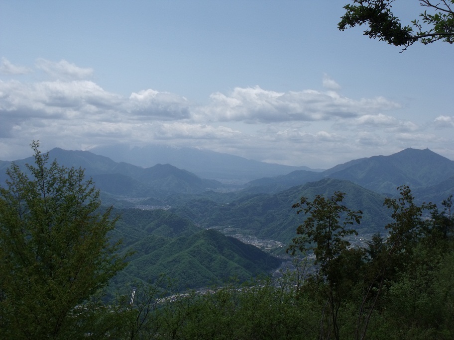 頂上から富士山方面を望む富士山は左の奥、上半分が雲の中 .右が三つ峠