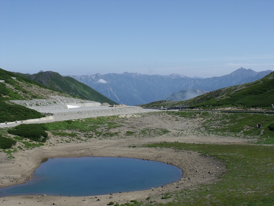 9日、畳平から北アルプス方面。右の尖ったのが槍ヶ岳。中央部が北アルプス連山。