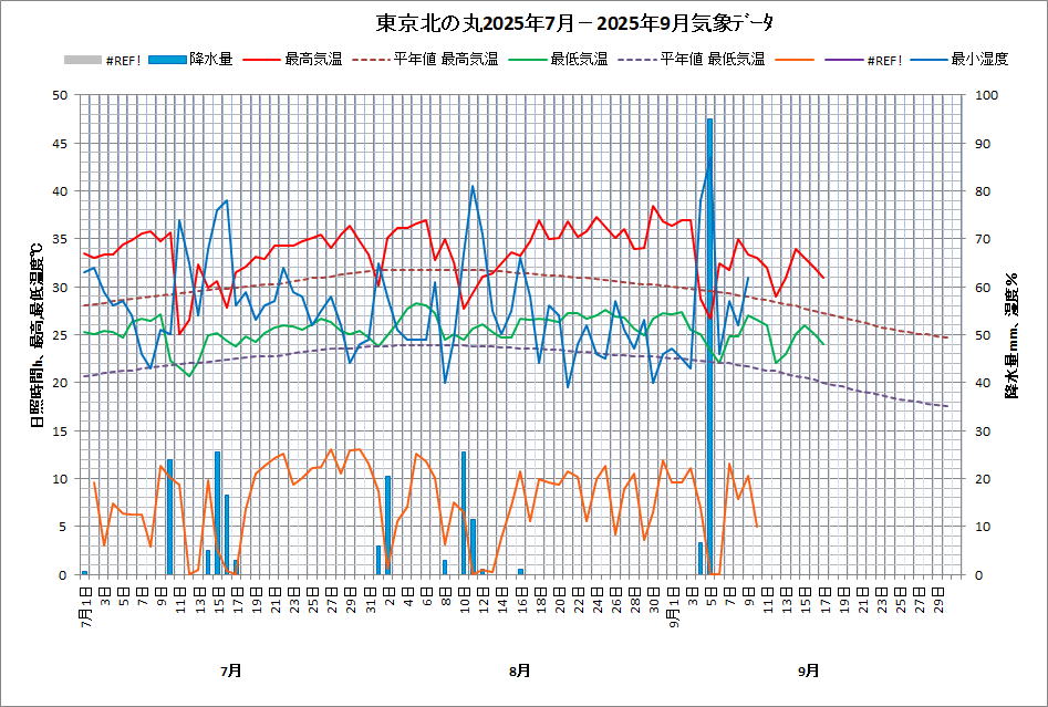 | 2019年7月−9月 | 48、東京北の丸の毎日の気温、湿度、降水 | ||